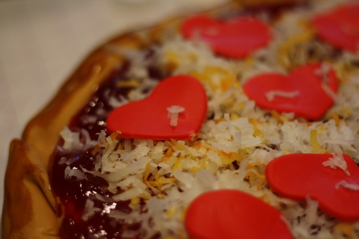 For the sauce, I used strawberry cake filling that I purchased from Party Time (delicious!). For the cheese, I used coconut. For pepperonis, I made red heart shapes out of fondant. I wanted it to be a Valentine's themed pizza!